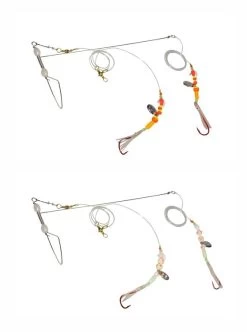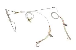 Dieses System ist speziell für am Grund lebende Fische, wie den Steinbeisser, entwickelt wurden. Durch seine Konzeption ist es dem Beißverhalten und der natürlichen Nahrung dieser Fische angepasst. Das Vorfach besteht aus hochwertigen Komponenten wie zwei roten VMC-Meereshaken der Gr. 6/0, einer 0,8mm starken Hauptschnur mit 33kg Tragkraft und starkem Norwegenwirbel. Weitere Bestandteile sind Spinnerblätter, Leuchtoktopuse, Propeller-Spinner und Leuchtperlen. Es besteht aus einer Ober- und einer Nachläufermontage inkl. Grundboom. Weiter gibt es jedes Modell in zwei Ausführungen in rot-gelb oder selbstleuchtend und wahlweise mit oder ohne 200g Blei. Das Vorfach ist in einer Mesh-Tasche verstaut, welche 4 Ösen zur Befestigung besitzt. Diese kann dann in die entsprechende Dieter Eisele Vorfachtasche eingehänkt werden. Die Maße sind 34x18cm (LxB).