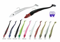 Dieser Gummiköder besteht aus dem Twitcher Jigkopf, der ideal für alle Sandaalimitationen ist, und dem Hogy Paddel in der Variante HDUV. Der Jigkopf ist mit einem verzinnten 60° VMC High Carbon Jig-Head Haken mit ultrascharfer Spitze ausgestattet. Dieser Köder ist ideal für die Präsentation im Freiwasser. Der Paddelschwanz sorgt für ausreichend Druck und Aufmerksamkeit, die durch die UV-Kunststoff- und Glitterplättchen noch enorm gesteigert wird. Horizontal angeboten werden flankierende Bewegungen auf Zug an der Rutenspitze zu wirklich lebendigen Bewegungen im Köder. Abwechselnd links und rechts flankiert der Köder tanzend das Wasser und bekommt das verführerische Spiel eines lebendigen Sandaals. Die Jigköpfe sind farblich auf die Paddelschwänze abgestimmt. Dieser Kunstköder ist in vielen verschiedenen Farben und Gewichten von 100g bis 185g erhältlich.