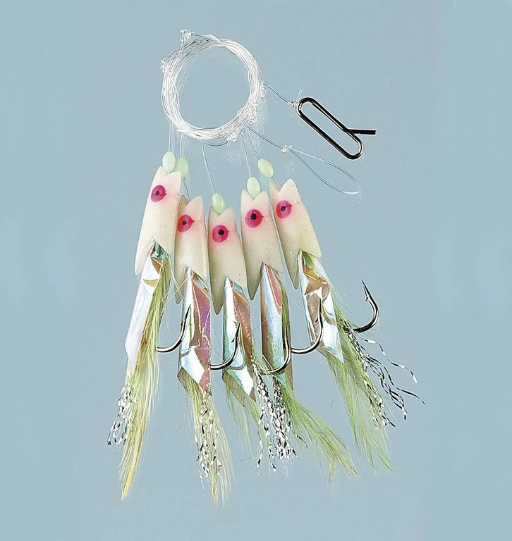 Dieses Vorfach ist universal im Einsatz. Je nach Größe ist es für Hering, Makrele, Dorsch oder Seelachs einsetzbar. Die Größe 2 und 3/0 besitzen 5 Haken, während die Größe 7/0 3 Haken besitzt.