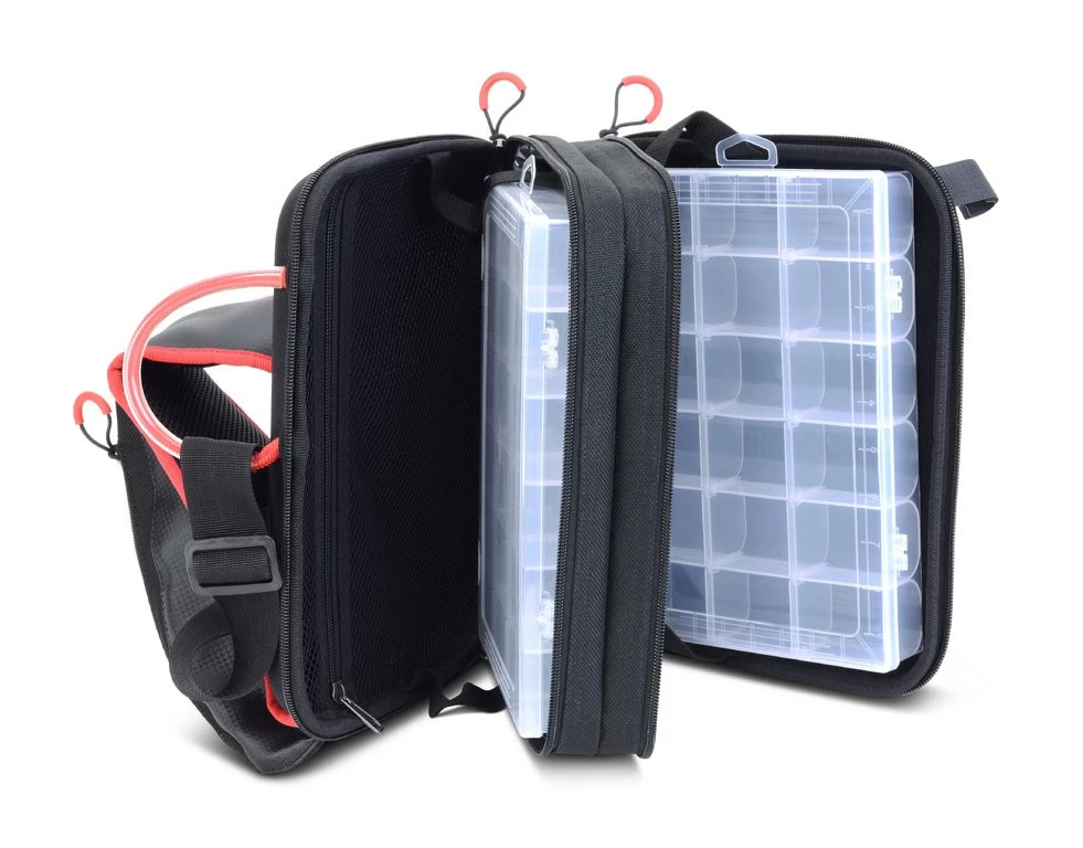 Die SF Swing L lässt sich auch über lange Strecken einfach tragen, da die Tasche eng am Körper anliegt. Neben den beiden Hauptfächern für Köderboxen, welche mittels Klettverschluss gegen ein herunterfallen gesichert sind, bietet die Tasche 2 Staufächer für Zubehör und einen Zangenhalter am Tragegurt. Alle Reißverschlüsse sind mit extra stabilen Schlaufen versehen, welche selbst mit Handschuhen oder nassen Händen ein leichtes Öffnen und Schließen ermöglichen. Die Tasche kann bei einem Köderwechsel einfach vor den Bauch gehängt und geöffnet werden, so ist ein bequemer Zugriff auf Ihre Köder möglich.