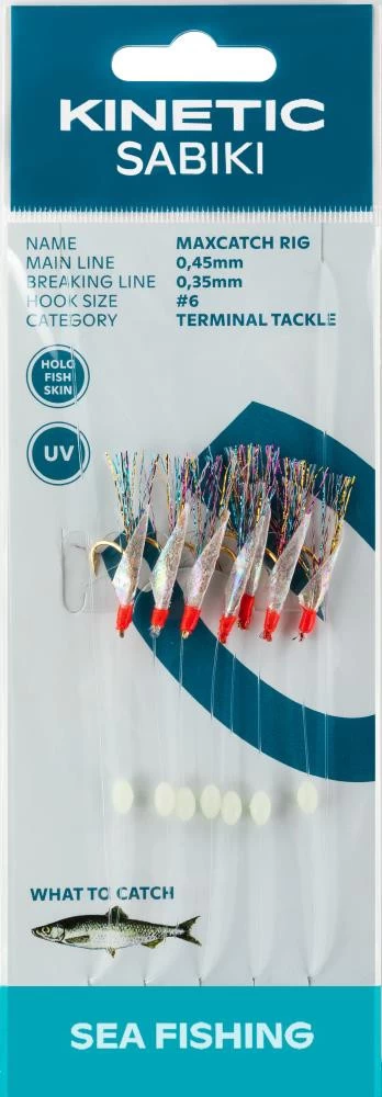 Das Kinetic Sabiki MaxCatch hat 7 Haken und die Stärke, um Ihren Eimer schnell zu füllen. Kleine, aber kräftige Haken biss-provozierender Fischhaut und Flash-Fibern funktionieren nun mal perfekt!