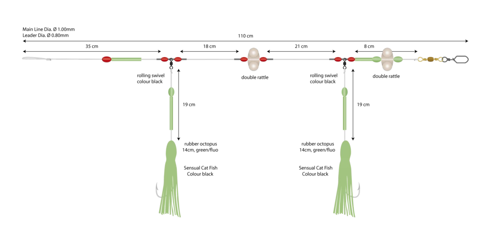 Tolles Rig für Seewolf und große Lumbs. Durch die fluoreszierende Tintenfische und Geräuschrasseln können die Fische den Köder leichter lokalisieren – in diesem Fall sind Fischfilets die beste Wahl. Das Rig ist ideal für das Angeln mit schweren Gewichten in Tiefen von 50m-100m. Das Rig ist 110cm lang und besteht aus einer 1,00mm starken Hauptschnur und einer 0,80mm starken Vorfachschnur.