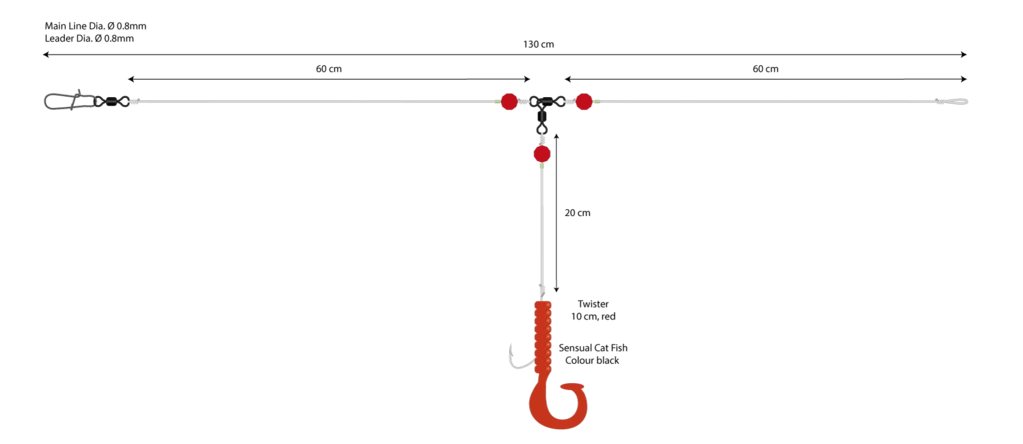 Vielseitiges und einfaches System für Dorsch-, Seelachs- und Lengangeln unter Verwendung von Pilkern oder Blei als Gewicht. Zur besseren Fängigkeit kann der Haken mit Fischstückchen garniert werden. Dies ist ein Universalsystem zum Pilken. Das Vorfach ist 130cm lang und die Schnur 0,80mm stark.