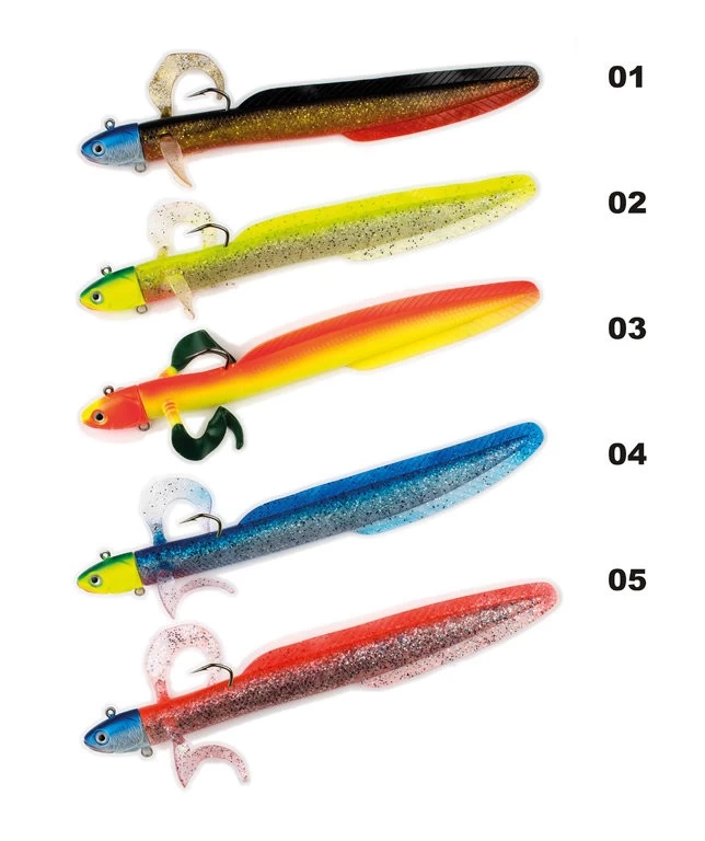 Ein universell einsetzbarer Jigköder der besonderen Art. Beim Ablassen erzeugt dieser Gummifische enorme Lockreize, denen die wenigsten Raubfische wiederstehen können. Am Kopf befindet sich eine zusätzliche Öse, in die ein zusätzlicher Angsthaken (Stinger) angebracht werden kann. Diesen Gummifisch-Jig gibt es in 5 verschiedenen Farben, wobei eine davon selbstleuchtend ist.