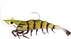 Bei dieser Version ist der Kopf vom Körper getrennt und besteht somit aus zwei verschiedenen Teilen, die man individuell zusammenstellen kann. Der Bleikopf ist ein naturgetreues Design einer Garnele und passt perfekt zum Körper, der durch einen innenliegenden Hakenkanal einfach zu montieren ist. Die zwei unterschiedlichen Körper unterscheiden sich durch die Schwanzformen – 1 Mal gibt es eine natürliche Garnelenform und 1 Mal einen Paddelschwanz für mehr Aktion. Es gibt zwei Größen von 8cm (18g) und 11cm (28g).
